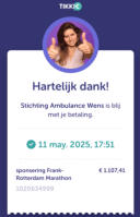 Finishen=Volbracht!De Marathon lopen inclusief alle trainings kilometers en aan de hand van elk gelopen kilometer, door deze te laten sponsoren, een mooi bedrag binnen te halen voor St. Ambulance Wens Nederland waarmee weer nieuwe wensen vervuld kunnen worden. € 2204,61 Dit streefbedrag, de geboortedatum van Peter in een bedrag uitgedrukt, is binnen. Een bijzonder bedrag om bijeen te hebben mogen lopen! Doneren blijft nog even mogelijk. Voor nu dank je wel! Dank jullie wel ! Frank